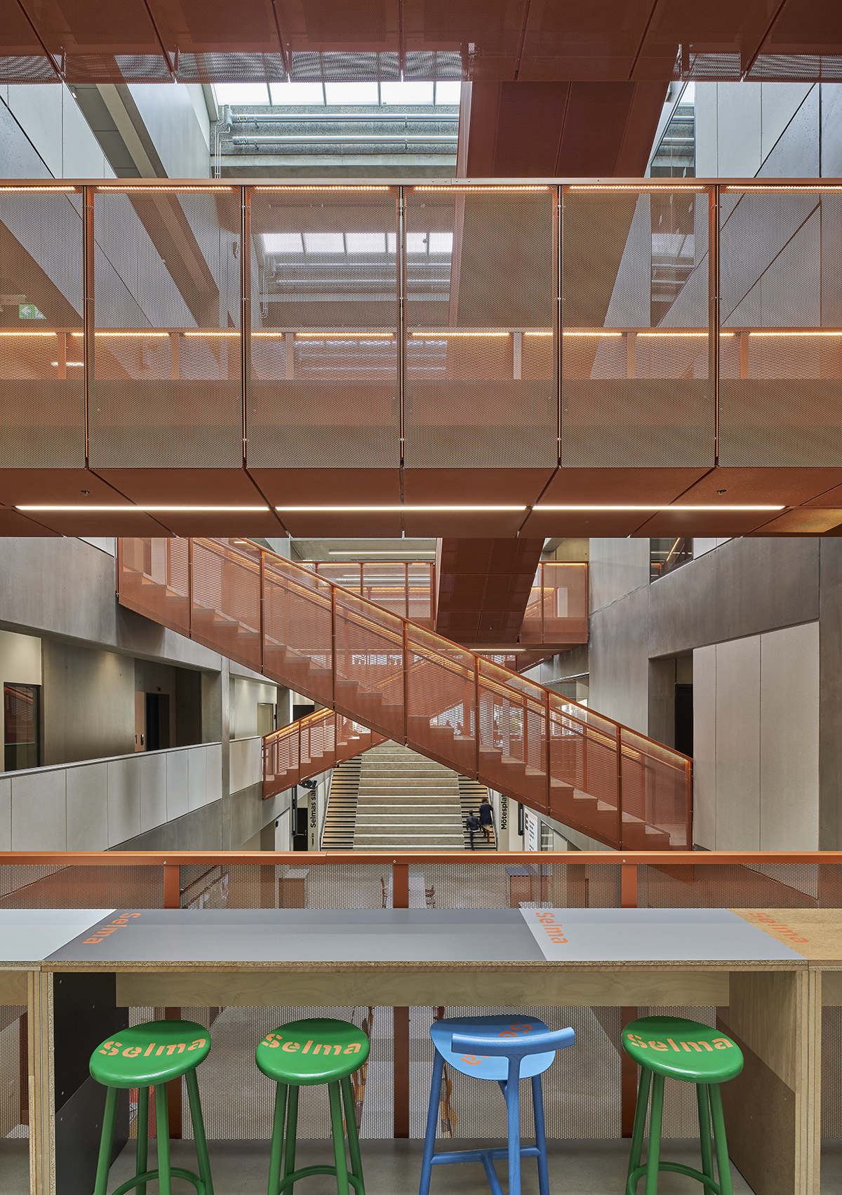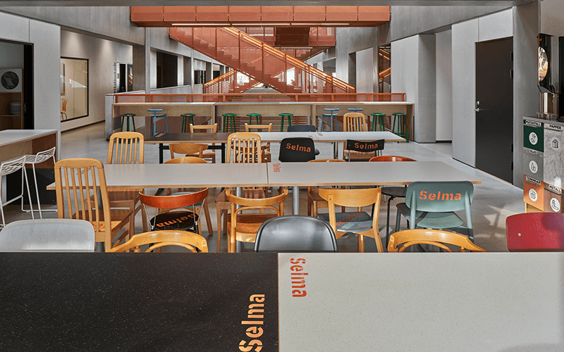 Med 90 procent återbrukade möbler är denna inredning onekligen ett etiskt föredöme. Men är den ett estetiskt? Det som från början sågs som en nödlösning, föranledd av budgetnedskärningar, har drivits till sin spets; inredningsarkitekterna har gjort en dygd av nödvändigheten och skapat en ”anti-inredning” som provocerar genom sin enkelhet och medvetna avsaknad av konventionella skönhetsambitioner. Projektet är en hyllning till slumpen, uppvisar en kakofoni av uttryck, och enda gemensamma nämnaren är en arg Selma-stämpel som målats på samtliga återbruksprodukter, billiga pallar som exklusiva stoppmöbler. En stämpel som bildar ett dekorativt mönster genom byggnaden, en snitslad och intresseväckande bana, men främst fyller en pedagogisk funktion genom sitt ifrågasättande av konsumtionssamhälles slit-och-släng-mentalitet. En okonstlad inredning, brokig och tillåtande, som väl speglar sin mångkulturella kontext. Början på en ny medvetenhet.