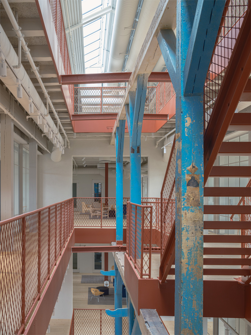 Krav på återbruk formar en arkitektur som lyfter husets ursprungliga karaktär genom smarta tillägg – en fin balans mellan obearbetad råhet och precist omformade detaljer. Tegelstomme och bärande träpartier exponeras i en sammanhållen materialpalett, där återbrukade element möter nya, enkla insatser som tydligt redovisas. Resultatet är robust men sofistikerat: en modern kontorsmiljö med optimal funktion, hållbarhet och livslängd, både rumsligt och estetiskt.