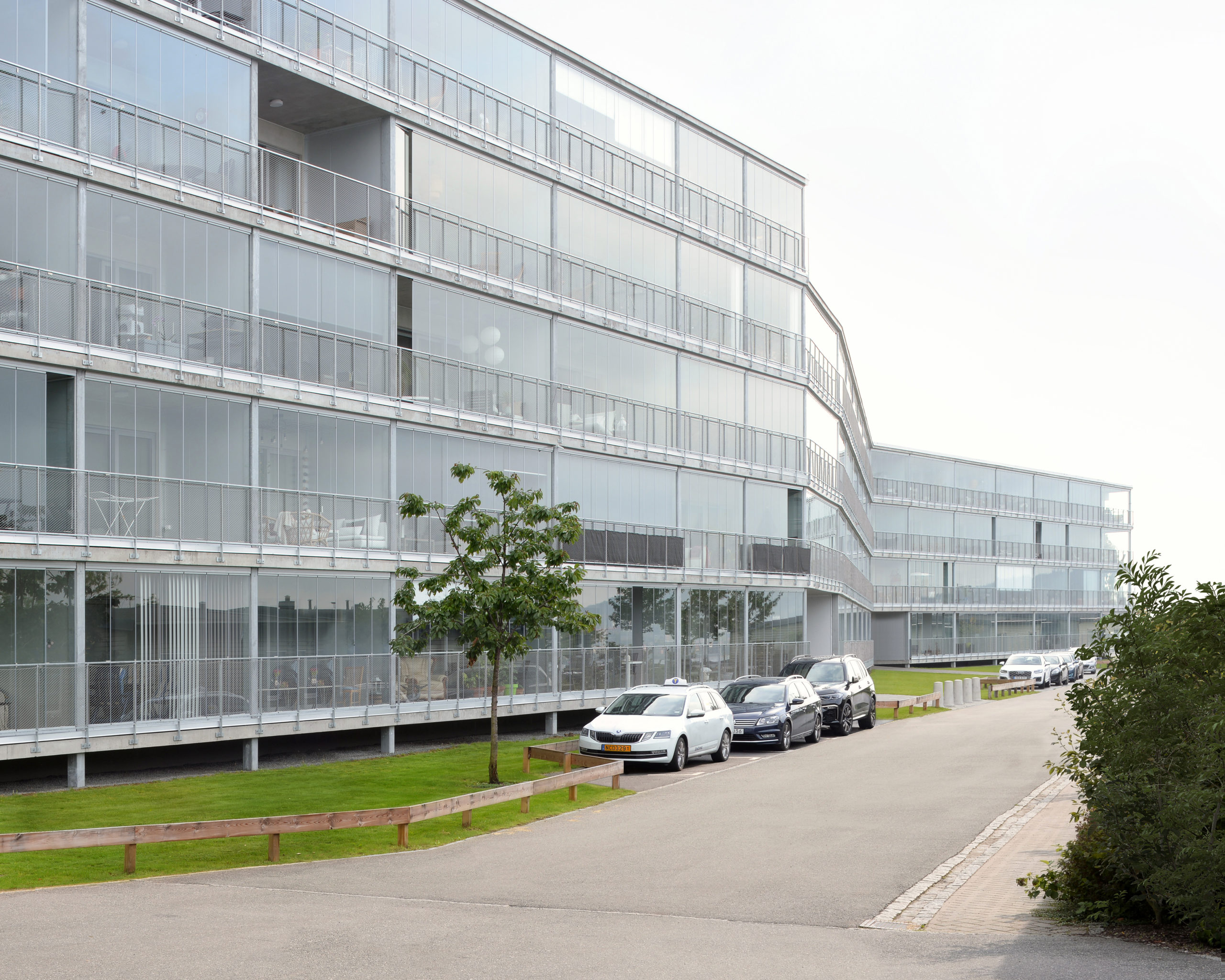 På en av tidigare exploatörer ratad tomt, intill E4 utanför Huskvarna, åstadkommer arkitekten attraktiva bostäder med pragmatism och stringens. I tät dialog mellan arkitekt, byggherre och konstruktör skapas en specifik typologi med större lägenheter för att komplettera det utbud av villor som redan finns i området. Ett mål har varit att bygga billiga bostäder för en ny målgrupp. Som bullerskydd vänds loftgångar och inklädda entréer mot motorvägen, medan stora balkonger och terrasser öppnar upp huset mot Vättern. De modulbaserade byggsystemen har styrt många val men i en tydlig prioritering av grundkvaliteter har ett fåtal mer påkostade detaljer, som stora skjutpartier i glas ut mot terrasserna, fått extra omsorg. Byggnadernas tak utnyttjas för gemensamma lokaler och ytor tillgängliga för de boende att ta i bruk. Ett radikalt grepp med en tydlig arkitektonisk idé tillför platsen oväntade värden och ger bostäder med stora inre kvaliteter. Projektet visar på möjligheter och alternativ för dagens gängse bostadsbyggande.