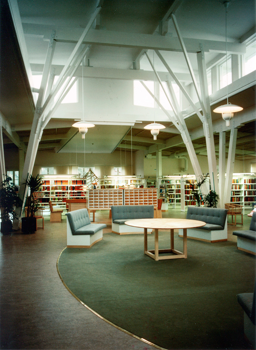 Byggnadens inre har vackra rumssamband med intim och vänlig karaktär. Särskilt utmärker sig biblioteket, där en pelarburen lanternin bidrar till att skapa ett vackert rum. Arbetslokalerna i byggnaden är utformade med känsla och omtanke.