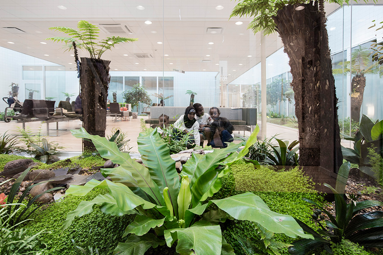 Genom tredimensionell fastighetsbildning lyfter arkitekturen upp huset; patienterna leds från gatan via entrétrappan upp till ett grönskande väntrum utformat som en välkomnande oas. Det är husets hjärta som får sin karaktär av exotiska växter i klimatiserade glasträdgårdar, fyllda av rikligt takljus.