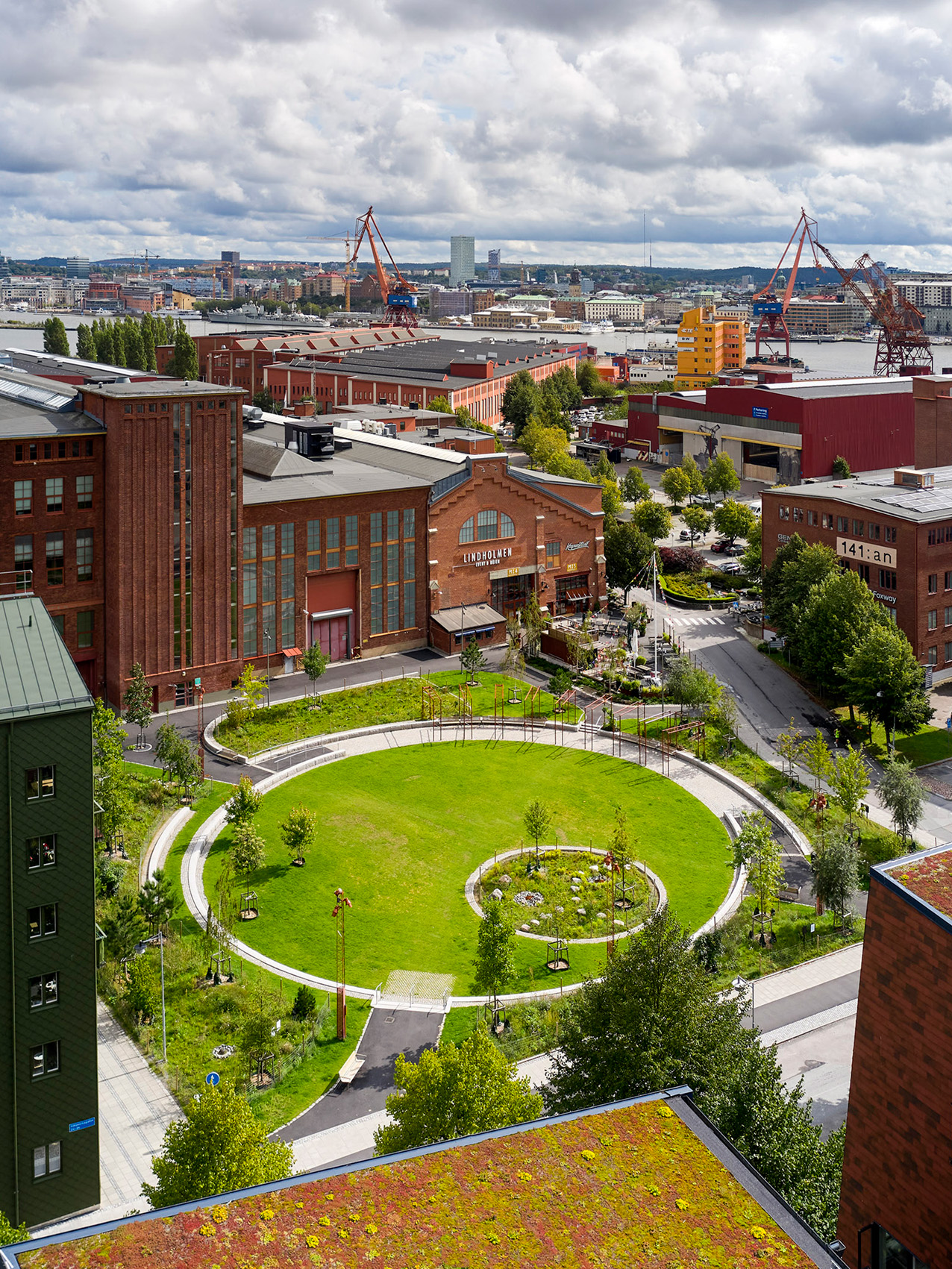 Huvudnumret i gestaltningen är en nedsänkt gräsyta med torktåliga växter som skapar ett inbjudande inre rum och en invit att leka eller koppla av. Utanför cirkeln breder mjukt formade kullar med ängsvegetation och spridda träd ut sig. Den artrika växtligheten kopplar till stadens gröna samband och etablerar parken som en viktig grön lunga. Höjdsättningen är både genomarbetad och funktionell – vid skyfall fungerar den sänkta cirkeln som vattenmagasin. Den kreativa markmoduleringen å sin sida hanterar stora volymer av massor som därmed inte behövt transporteras bort från platsen. Kullarna är rumsavgränsande och bidrar – ihop med växtmaterialet – till sinnlighet, naturprägel och lugn i den täta stadsmiljön.