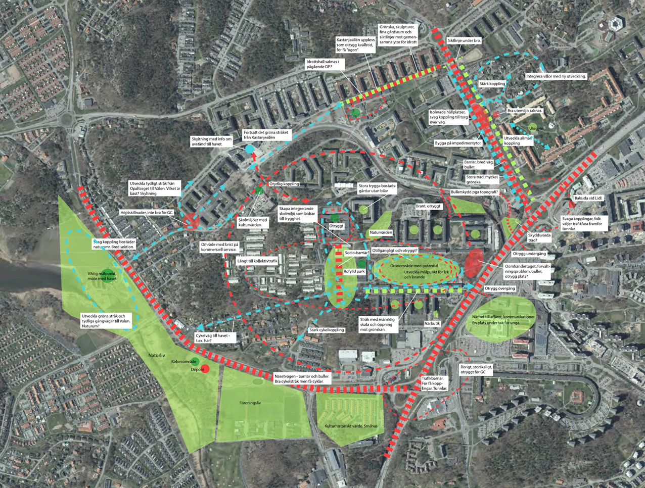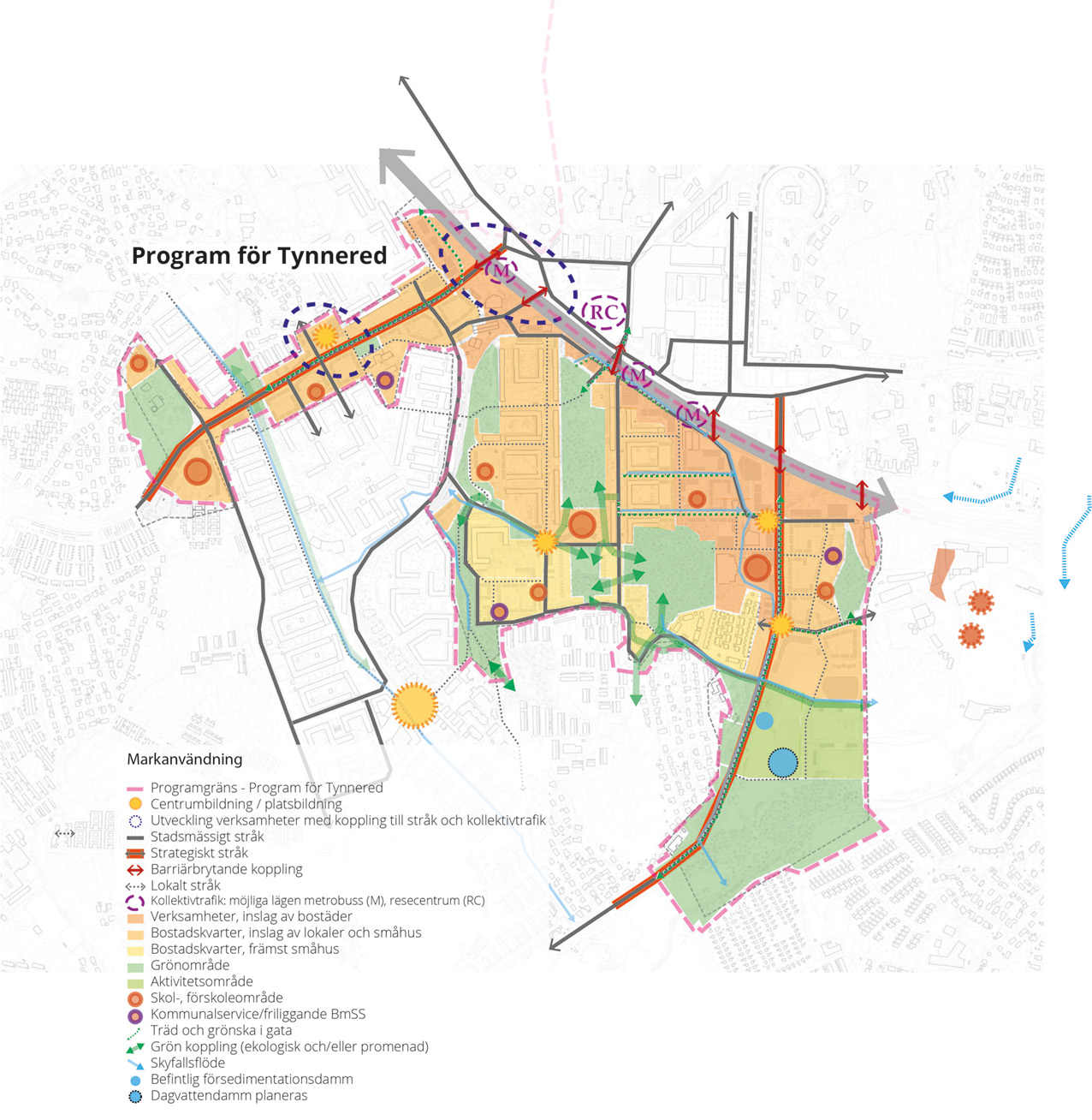 Förståelsen för Tynnereds kvaliteter och utmaningar genomsyrar alla delar av planprogrammet. På grund av stadsdelens isolerade läge, på en höjd omgiven av infartsleder, har nya kopplingar mot omgivningen varit viktiga. Breddade gångbroar mot Frölunda torg ska göra centrum lättare att nå. Genom att koncentrera ytor för lek, odling och umgänge längs genomgående gångstråk blir de också tryggare. Nya bostadshus är tänka som bullerskydd mot trafiklederna runtom och gör samtidigt bostadsgårdarna mer privata.