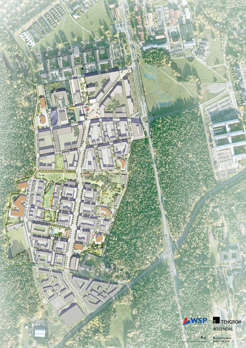 Rosendal är del av en större utvidgning av staden söderut – det är en plats på vägen från centrum ut mot mer perifert belägna och segregerade stadsdelar. Särskilt viktig för att binda samman stadsdelen med omgivningen är en ny spårvagnslinje längs huvudgatan, vilken kantas av högre byggnader med höga bottenvåningar. På samma sätt binder ett brett parkstråk, gröna gårdar och omfattande gatuvegetation samman områdets ekosystem med omgivande grönområden. Viktiga målpunkter, som kulturhus och idrottshallar, har kommunen byggt tidigt. De har hög ambitionsinvå i väl valda lägen för att skapa investeringsincitament.