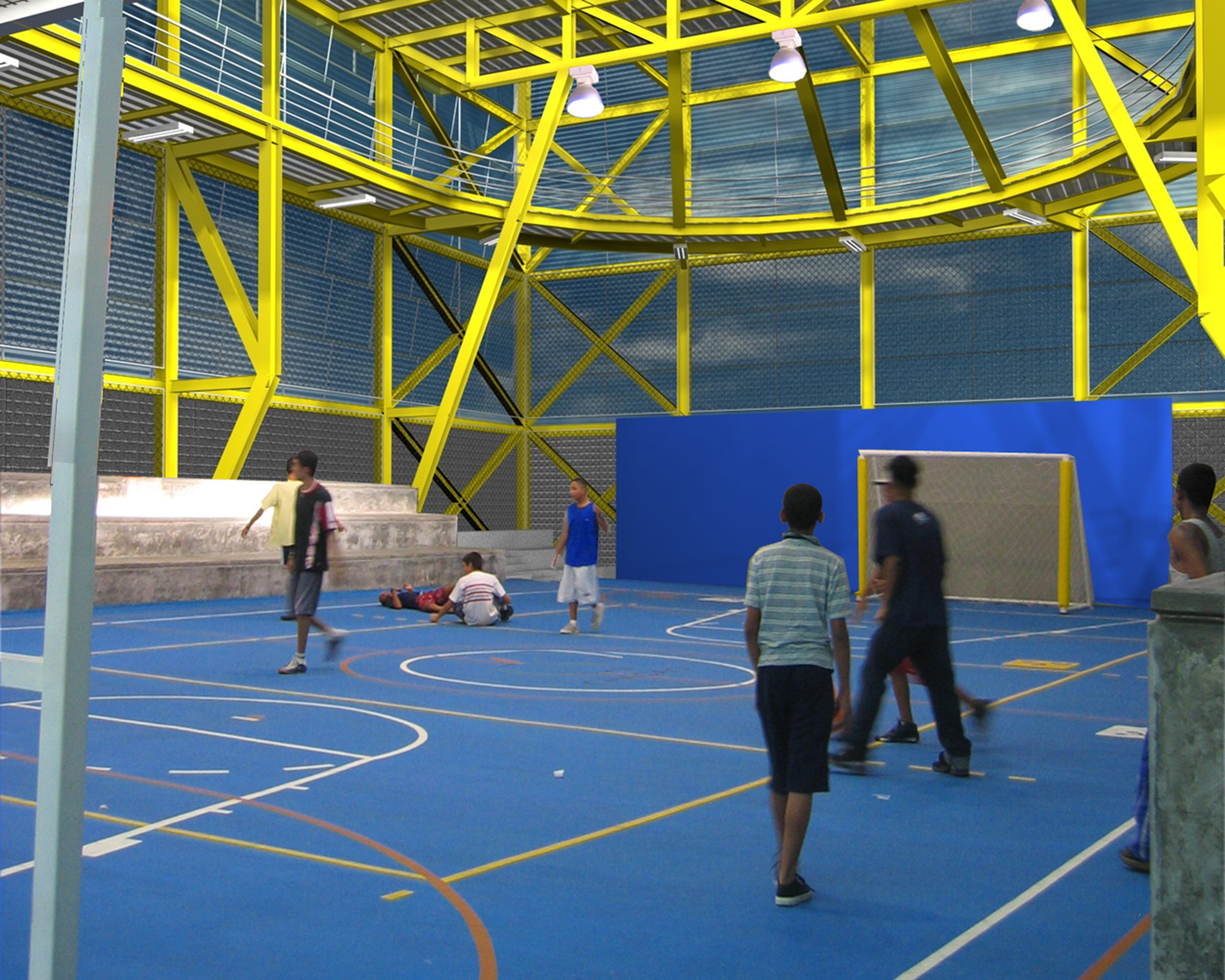 Det vertikala gymmet är ett prefabricerat byggsystem installerat på platsen för en nedgången idrottsplats i innerstaden. Designen utforskar en modulär och vertikal organisering av olika sportanläggningar (volleyboll, kampsport, löparbana, tyngdlyftning, basket etc.). Den vertikala strukturen kompenserar för bristen på 70 hektar idrottsytor i stadens slumområden.