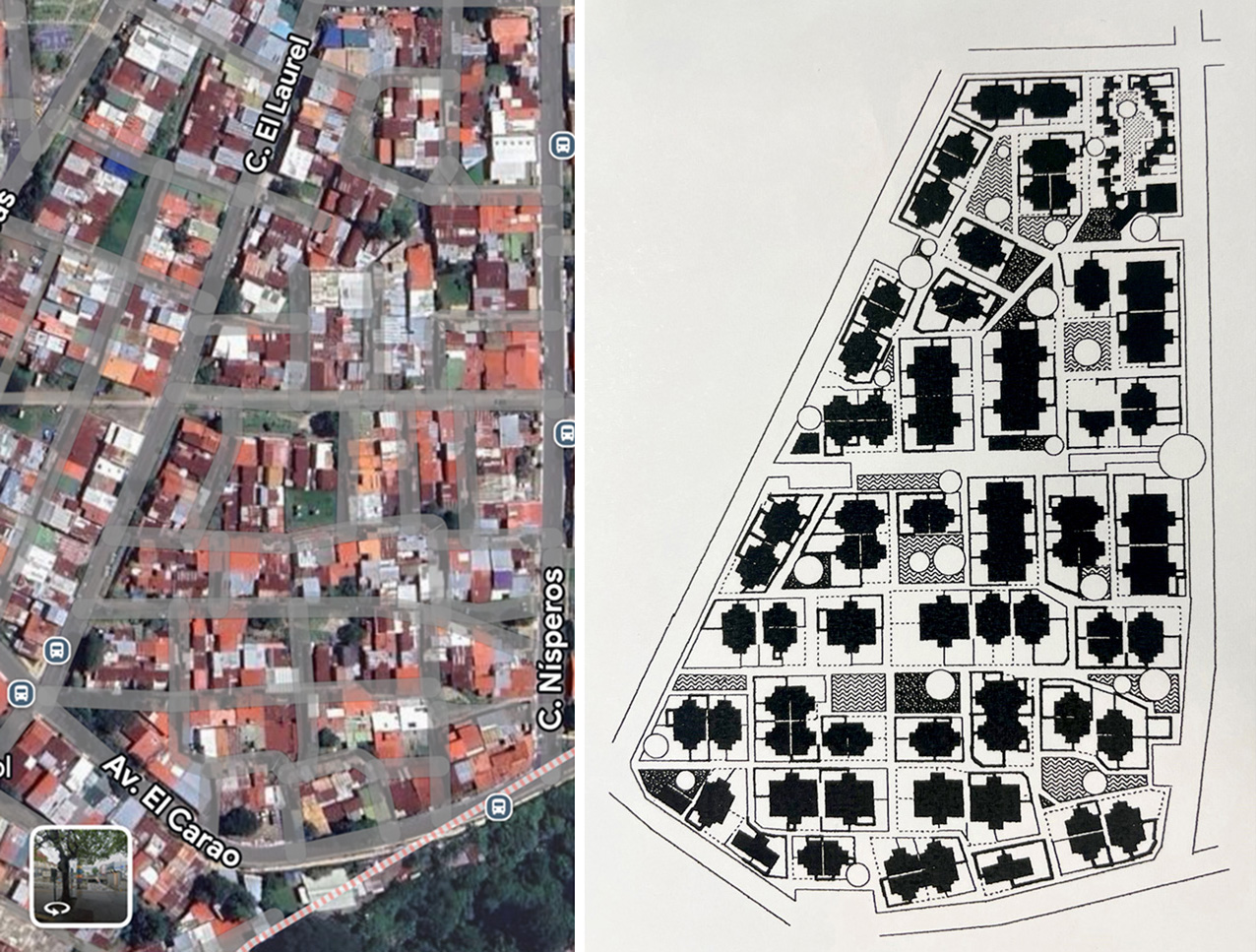 Områdesplan. Idag benämns området El Carao i Guararis södra del. Den södra änden av området vetter mot ett vattendrag, en bäck som ansluter till Rio Pirro vid den södra änden av Guarari. Vy över El Carao 2025 visar att bebyggelsen har förtätats jämfört med Morgans plan från 2000.