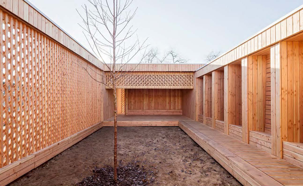 Volymerna och rummen lyckas med sina 550 m², varav hälften täckta, på ett imponerande sätt lösa en komplicerad urban kontext och möjliggör identifikation och deltagande. Interiöra och exteriöra rum är antingen sammanlänkade eller separerade i en noggrant skapad följd av utrymmen. Ett inhägnat rum med täckta nischer mot öst och syd fungerar som en introvert trädgård – ett område för tillbakadragande och stillhet. Sittplatser mot syd och väst omger en stor gård för evenemang, som öppnar sig inbjudande västerut mot det tidigare militära området. Det gemensamma huvudrummet vetter mot denna gård och kan användas som scen eller auditorium. Två extra förråd kan i framtiden användas som kiosk och verkstad. Byggnaden erbjuder en stor variation av rum inom ett mycket litet område, vilket gör att dess användare känner sig hemma på sitt eget sätt. Täckta rum och inneslutna gårdar skyddas från den trista omgivningen och vänder sig mot den trädbevuxna vägen och de öppna fälten väster om området. Konstruktionsdelar, vägg- och takytor, golv och inredning är gjorda av obehandlat trä.
