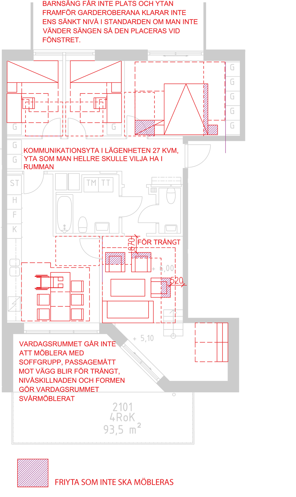 Jag blir dock inte förvånad när jag hör detta. Jag ser det dagligen när jag granskar lägenheter ur tillgänglighetssynpunkt. Måtten pressas under de funktionsmått som fungerar för gående många gånger. Att minska all icke säljbar yta är ett krav, ett annat är att få in så många rum på en så liten yta som möjligt för att lägenheten ska se stor ut. Resultatet blir därefter. Ska lägenheten dessutom verka luftig, det vill säga med många dörrar och öppningar så att man kan gå runt i den, blir det ingen möblerbar yta kvar, utan mest bara kommunikationsyta.