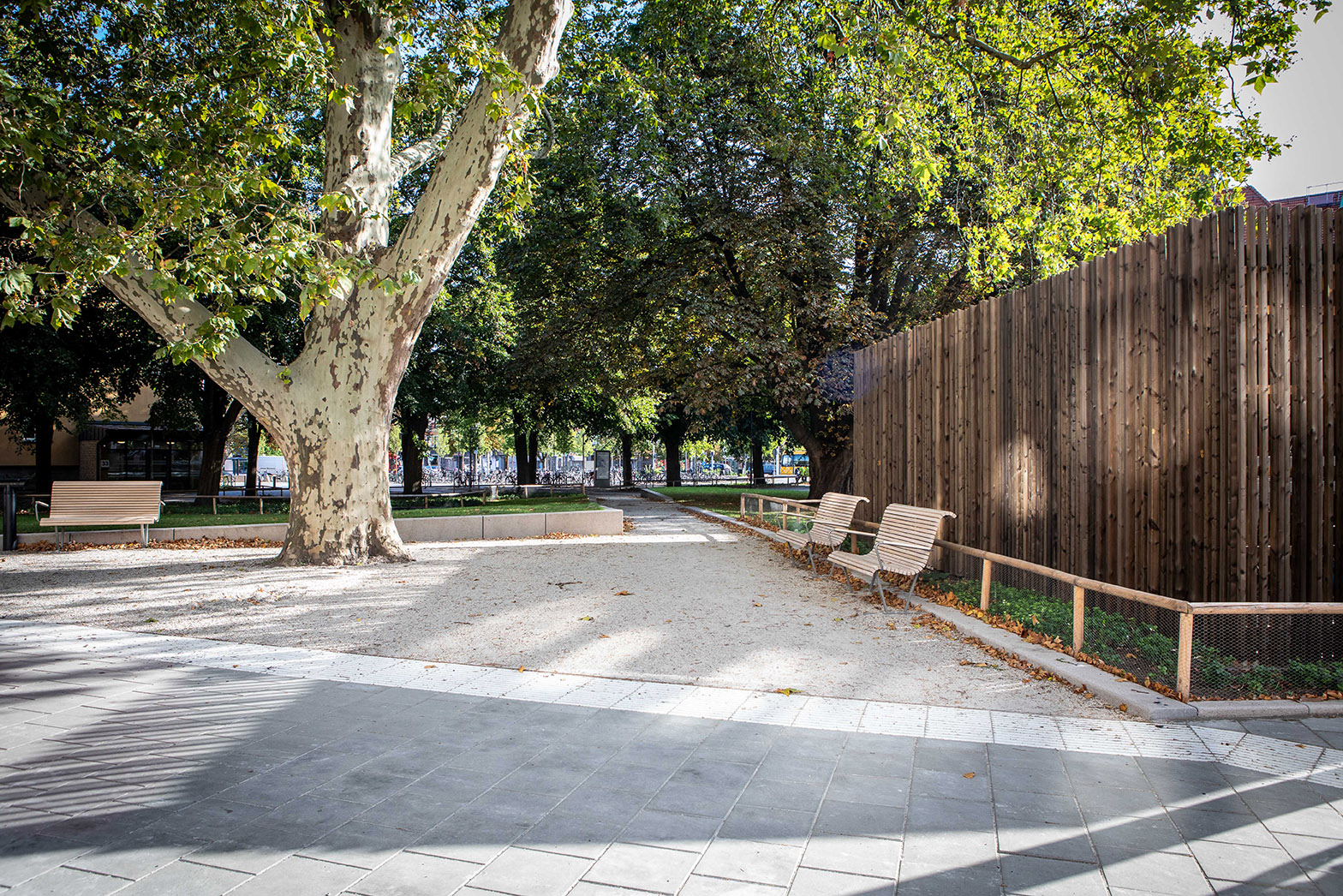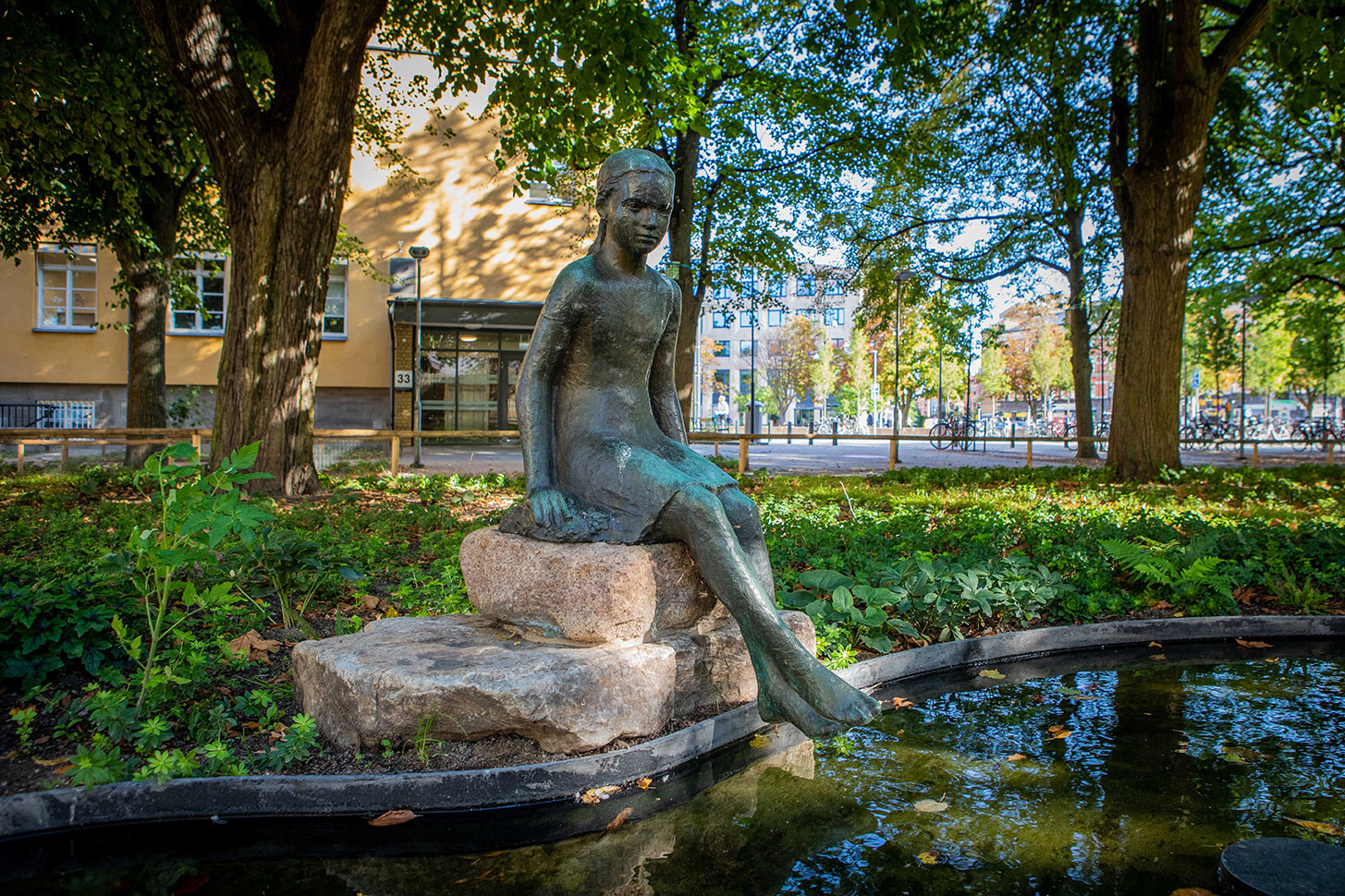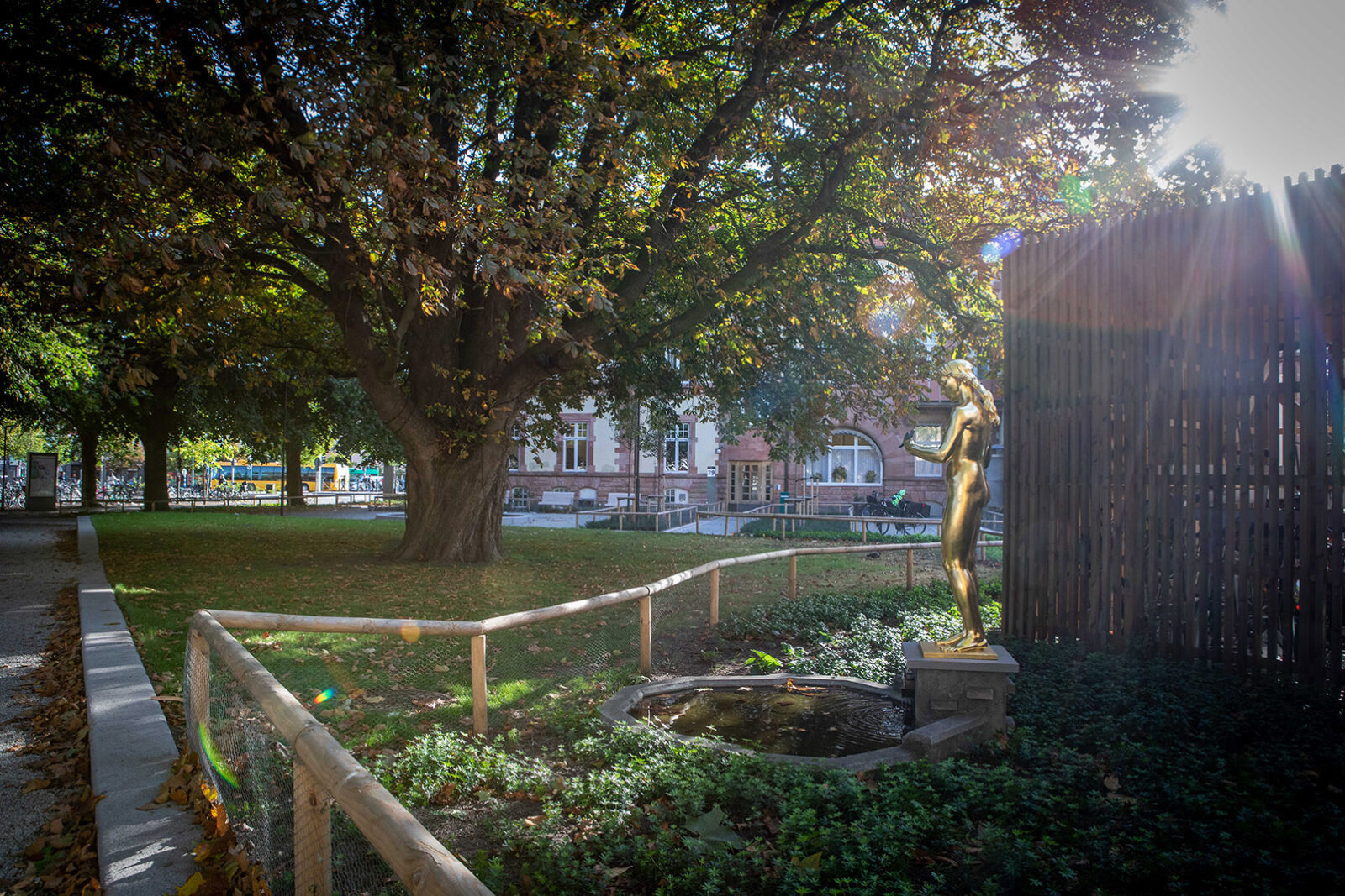 Tre äldre skulpturer har restaurerats och placerats på nya platser i parken. Skulpturerna inkorporerar vatten i form av porlandefontäner eller stilla vattenspeglar. De omges av nya planteringar som skapar ett respektfullt möte mellan gammalt och nytt. Parken håller två cykelhus som har en varierad träfasad med fasadgrönska.