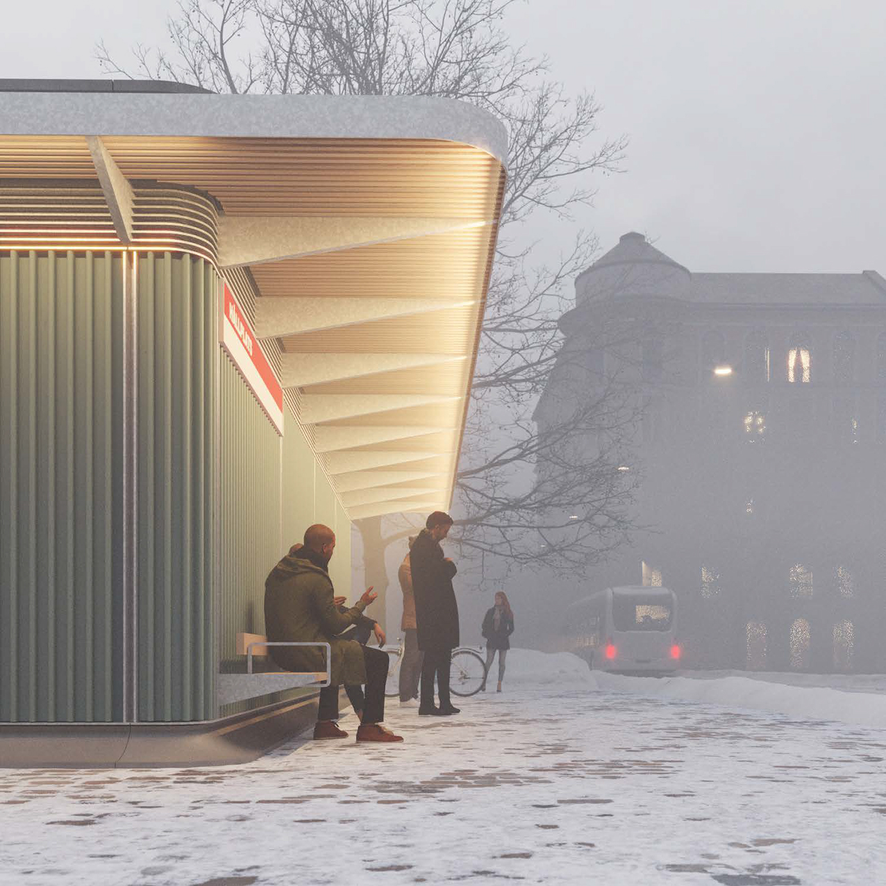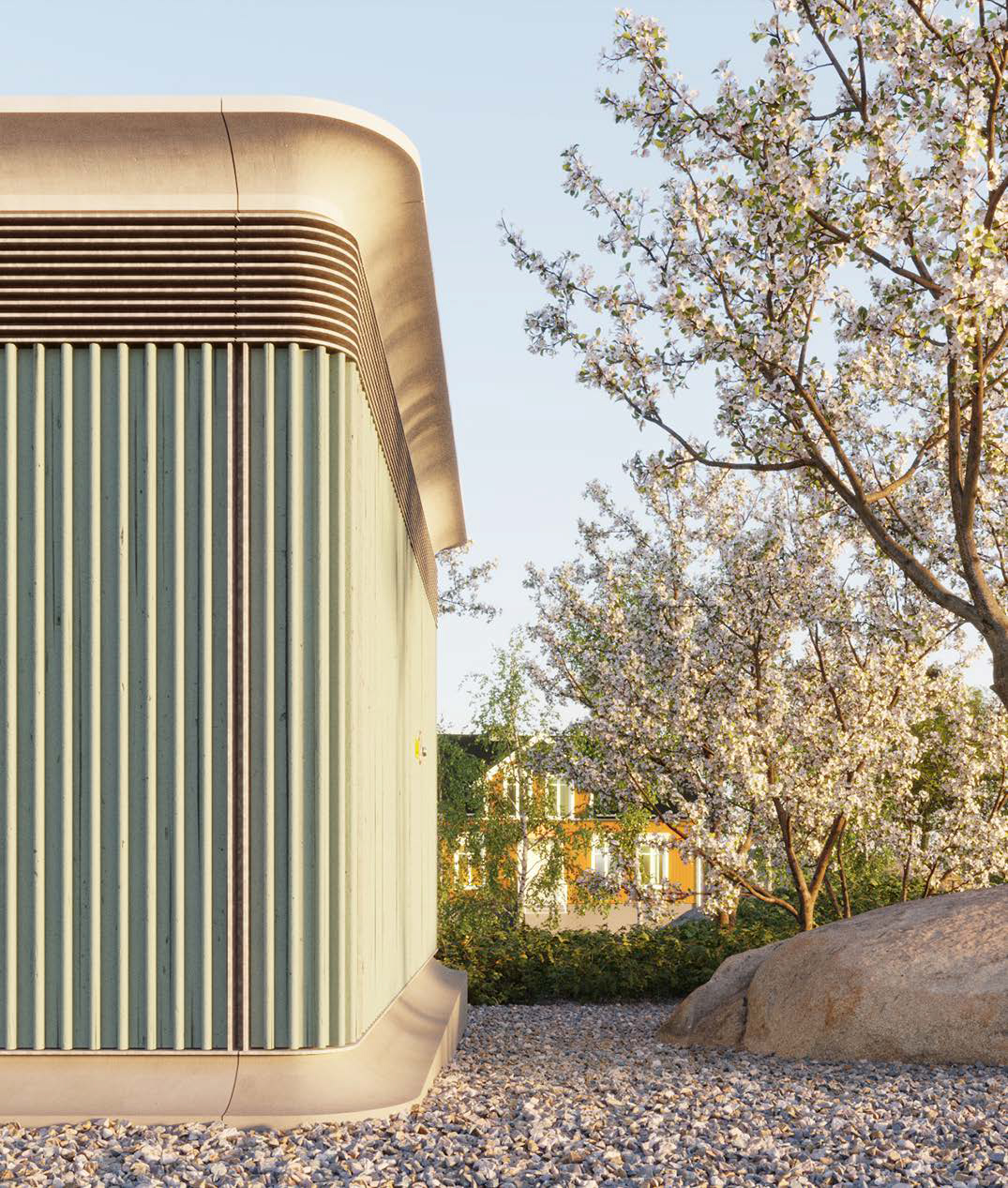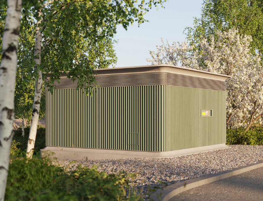 Att smälta in framstår vid en första anblick som en diskret, nästan anonym teknikbyggnad. Vid närmare betraktande ser juryn den stora omsorg med vilken det lilla husets byggnadsdelar har omhändertagits. De rundade hörnen ger ett vänligt intryck och formen fångas upp i sockelns anslutning till marken och i den eleganta takfoten av fiberarmerad betong.