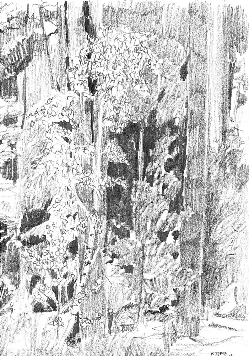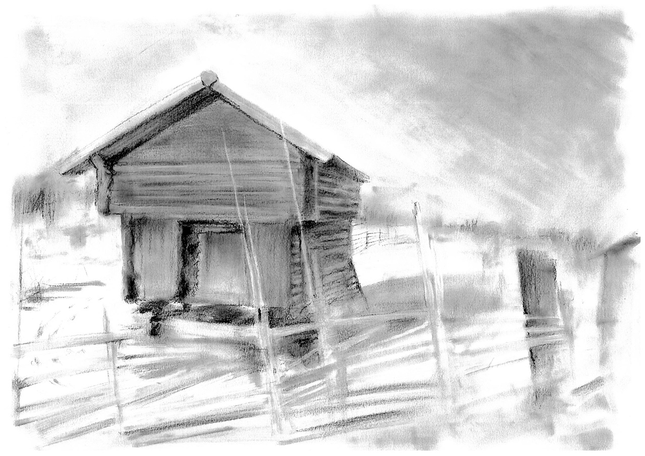 Teckningarna förmedlar temperatur, ljus och mörker, skärpa och oskärpa likt filmutsnitt. Med sinne för fotografisk komposition laddas vardagens miljöer med atmosfär och stilla dramatik.