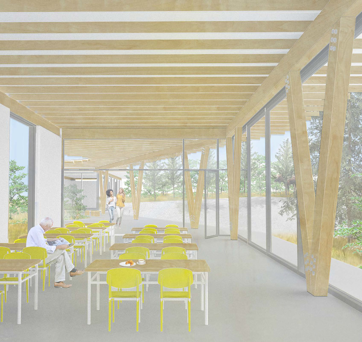 Förslaget har ett vackert skärmtak och byggnaden är skickligt genomarbetad. Själva idén bygger på att den kan göras i flera olika storlekar och anpassas beroende på vilka funktioner man behöver. Det är en klok tanke att utgå från, men man kan fundera över takets funktionalitet i en så öppen struktur.
