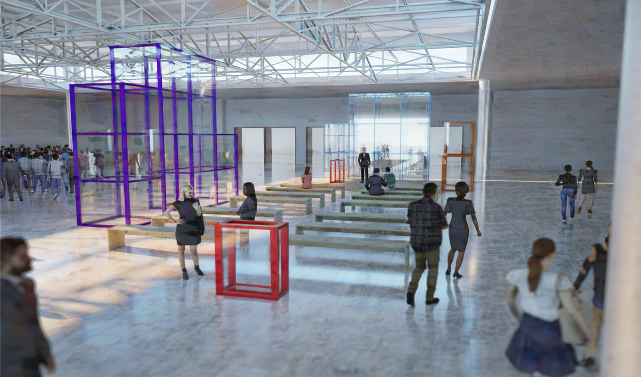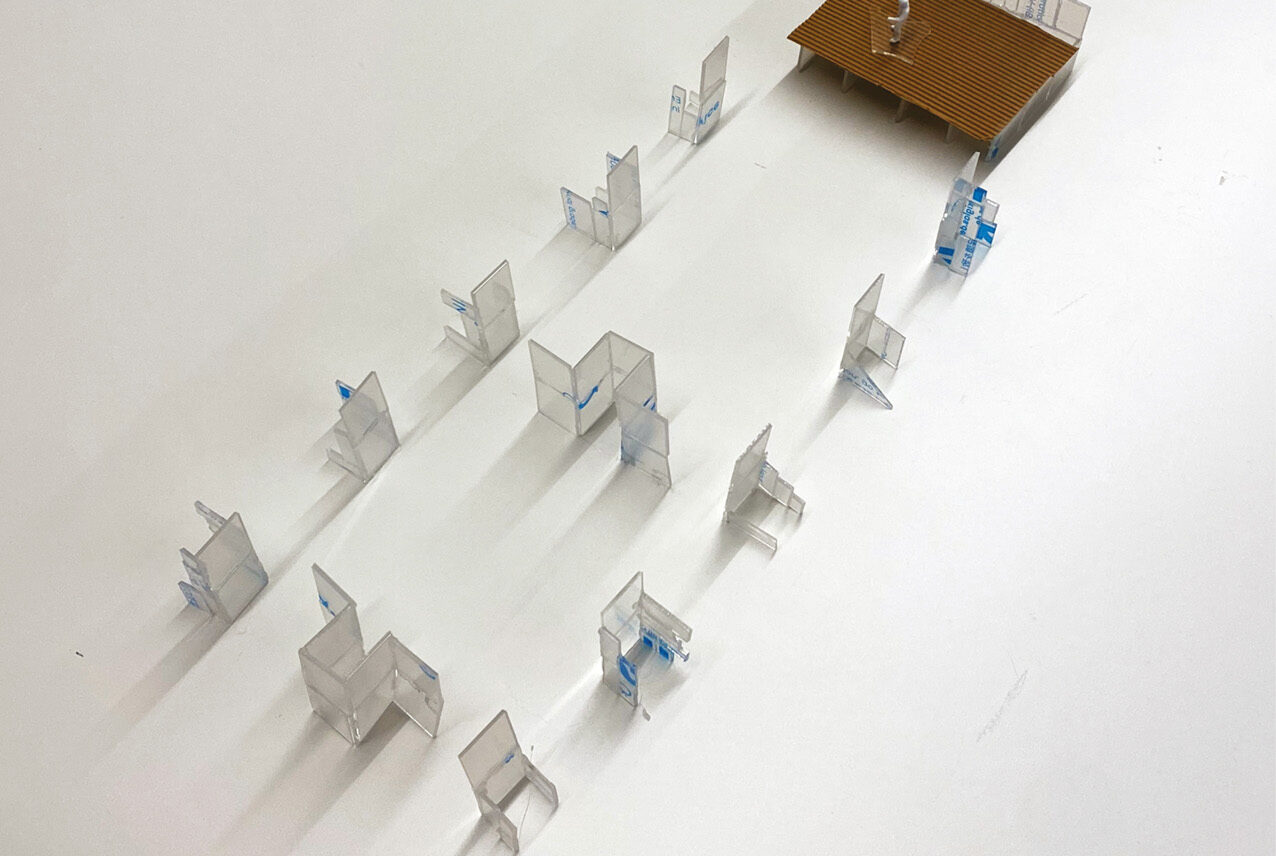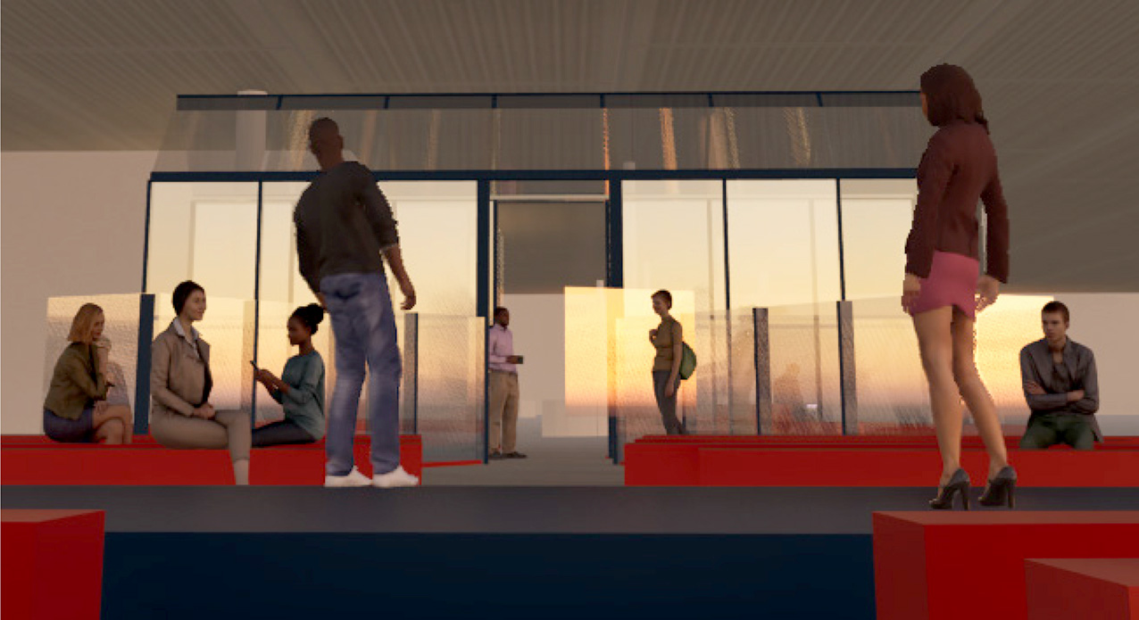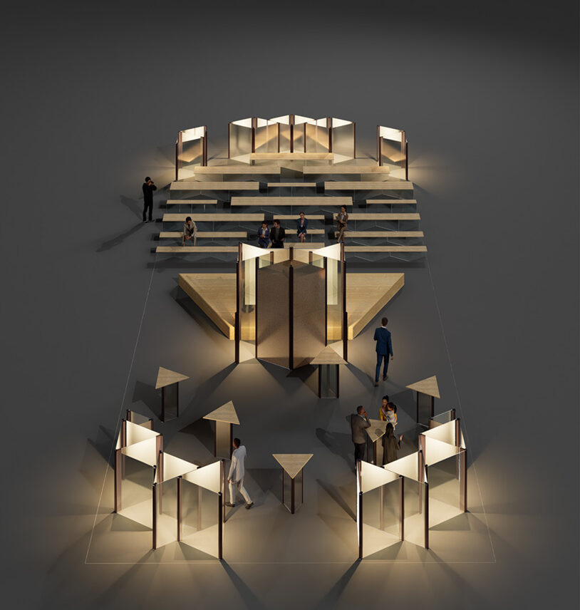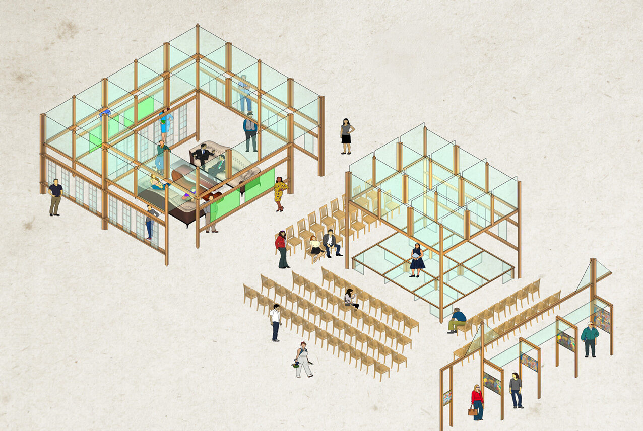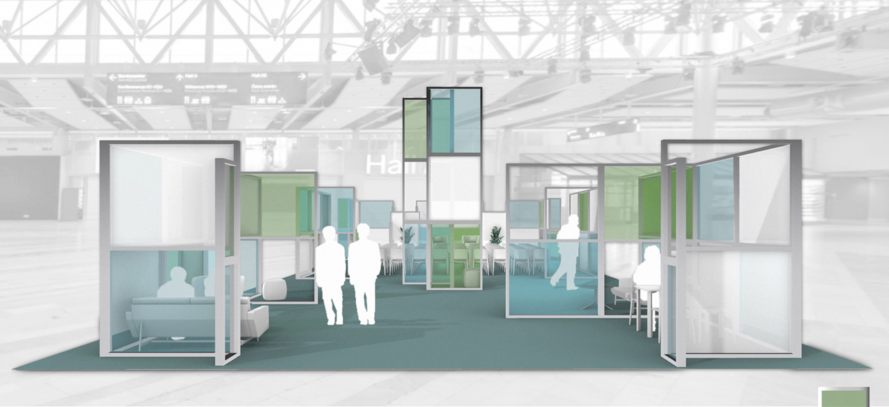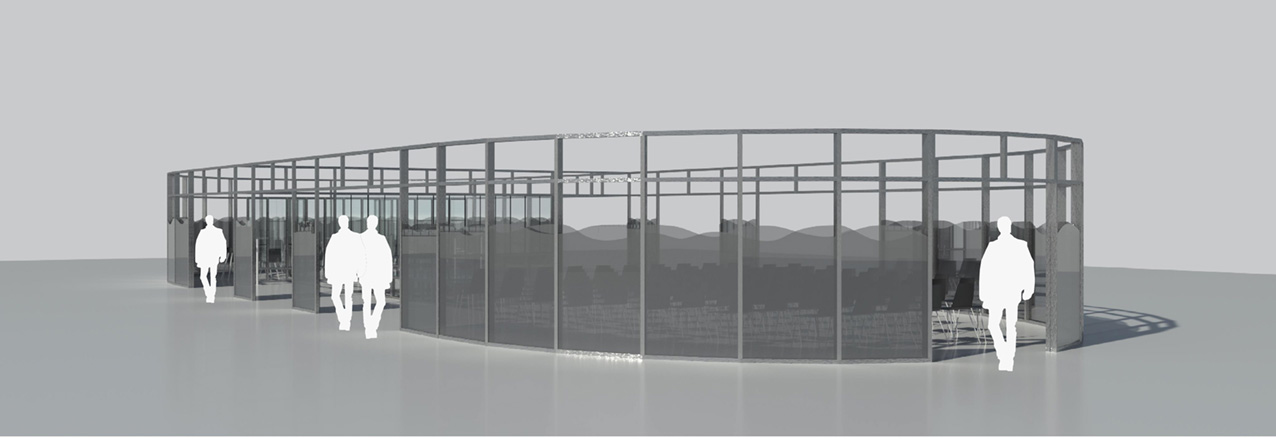 Ett poetiskt och konsekvent genomarbetat bidrag där glasets historia och cirkulära potential ges ett starkt arkitektoniskt uttryck, med en ny sorts strategi, där materialen delas upp och monteras ihop på ett innovativt sätt, unikt för mötesplatsen på Nordbygg.