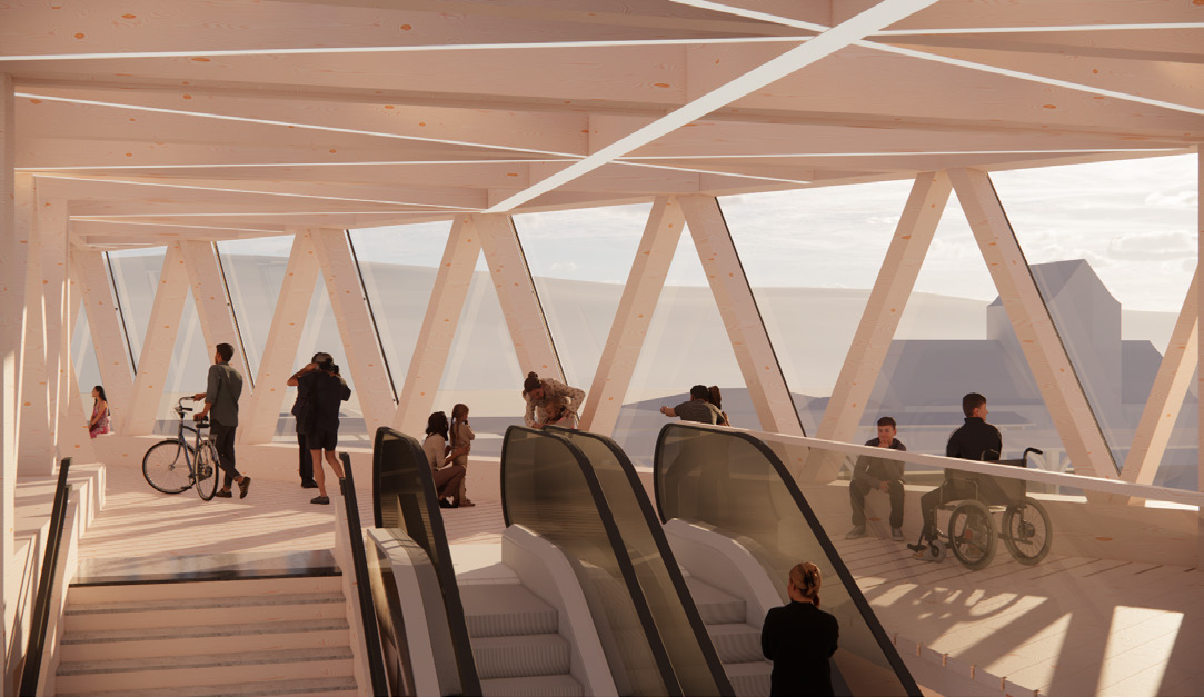 Liksom i steg ett visar Portaler konsekventa och gedigna trä- och glaskonstruktioner som kontrasterar mot stationshuset och övriga byggnader på platser. Förslaget har ett starkt och renodlat anslag där enkla grundvolymer, som utgörs av rätblocksformade nedgångar och anslutningsbyggnad, förbinds av en glasad träfackverksbro. Träet i anslutningsbyggnaderna, i gångbrons limträfackverk och perrongtaken utstrålar vänlighet, och har fördelar ur hållbarhetssynpunkt.